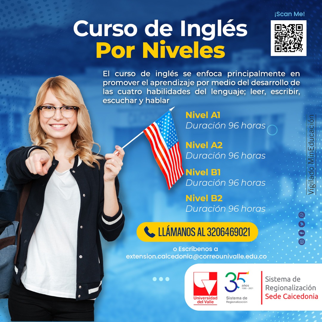 CURSO DE INGLÉS POR NIVELES El curso de inglés se enfoca principalmente en promover el aprendizaje de la lengua meta (inglés)por medio del desarrollo de las cuatro habilidades del lenguaje; leer, escribir, escuchar y hablar, por tal razón este curso está compuesto por 4 niveles de 96 horas cada uno.