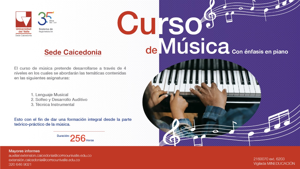 CURSO DE MÚSICA POR NIVELES: El curso de Música pretende generar en los participantes habilidades conceptuales y prácticas; así mismo desarrollar competencias en lecto-escritura musical, ejecución rítmica y técnica instrumental. Para el desarrollo de estas habilidades es importante tener una formación integral entre las areas de Lenguaje Musical, Solfeo, Desarrollo auditivo y Técnica instrumental con énfasis en Piano. |