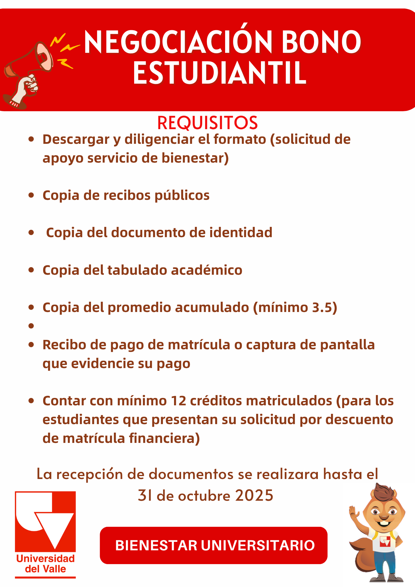 Beneficio acerca de la Negociación del Bono Estudiantil, el cual se presenta para las y los estudiantes que SÍ pagaron su matrícula financiera o que estén cursando último semestre para negociarlo por derechos de grado.